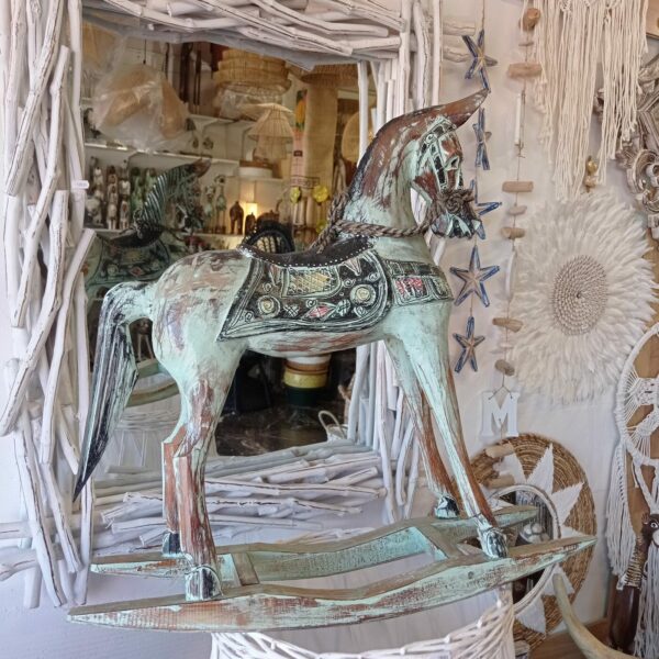 Cheval à bascule en bois sculpté, fait entièrement à la main, un objet de décoration élégant et fascinant par la richesse de ses détails et ses couleurs chaudes. Une figure animalière très sollicitée symbole de vitalité, de passion et de liberté. Adopter notre cheval, c’est inviter la nature chez soi.