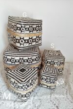 lot de 5 boîtes décorative en bambou tressées et peintes à la main. Un objet de rangement naturel, beau et simple , vous pouvez lui donner la fonction que vous souhaiteriez : déco, vide-poche, boîte à cadeau, rangement.. Libre cours à votre imagination, elle sera belle et utile là où vous la placerez.