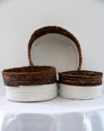 Panier rond en matière naturelle tressé et réalisé entièrement à la main. Panier multifonctions : vous pouvez y ranger tout petits jouets, livres, magazines, papiers, serviettes…..libre cours à votre imagination, il sera beau et utile là où vous le placeriez.